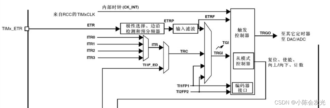 STM32定时器从模式 计数器在正常计数到自动重装载设定值时会产生更新事件,当设置的复位模式输入引脚检测到上升沿时,信号会传入从模式控制器,从模式控制器便会执行复位功能,将定时器进行复位,即更新事件,此时计数器会被重置为初始值(向下计数恢复到自动重装载,向上计数为0),若开启了定时器中断,复位操作也会触发定时器中断。控制时钟信号的门,当输入引号为高电平,开门,时钟信号正常传入定时器,定时器正常计数,输入信号低电平时,门关闭,定时器暂停计数。触发模式只能启动定时器计数,并不能停止定时器计数。以下三种模式主要是控制定时器的工作状态。
