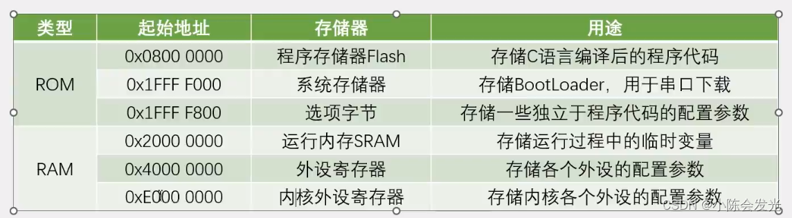 STM32-Flash闪存 STM32F1系列的FLASH包含程序存储器、系统存储器和选项字节三个部分,通过闪存存储器接口(外设)可以对程序存储器和选项字节进行擦除和编程。读写Flash的用途1.利用程序存储器的剩余空间来保存掉电不丢失的用户数据。2.通过在程序中变成(IPA),实现程序的自我更新。在线编程(ICP)用于更新程序存储器的全部内容,通过JTAG、SWD协议或系统加载程序(Bootloader)下载程序,例如ST-LINK使用SWD协议进行下载程序,每次下载都是将整个程序都覆盖掉。