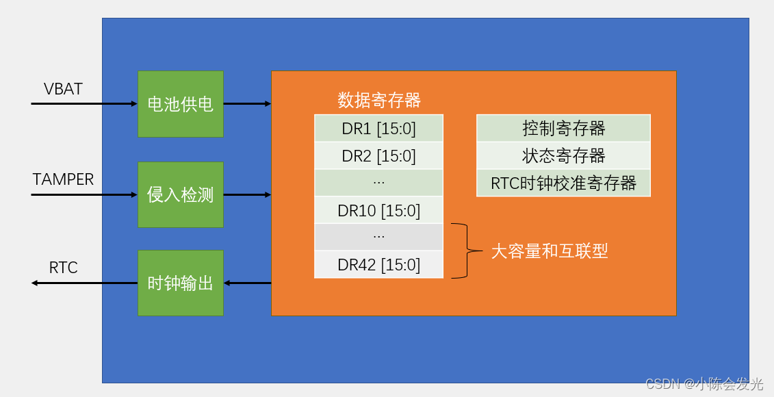 备份寄存器是42个16位的寄存器,可用来存储84个字节的用户应用程序数据。他们处在备份域里,当VDD电源被切断,他们仍然由VBAT(备用电池电源)维持供电。当系统在待机模式下被唤醒,或系统复位或电源复位时,他们也不会被复位。