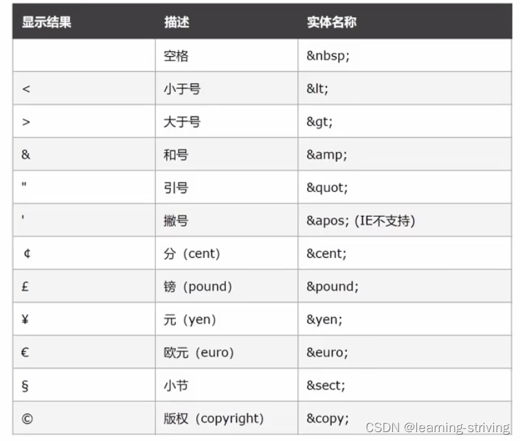 - 字符实体:代码中成段的文字,如果文字间想空多个空格,在代码中空多个空格,在渲染成网页时只会显示一个空格,如果想显示多个空格,可以使用空格的字符实体