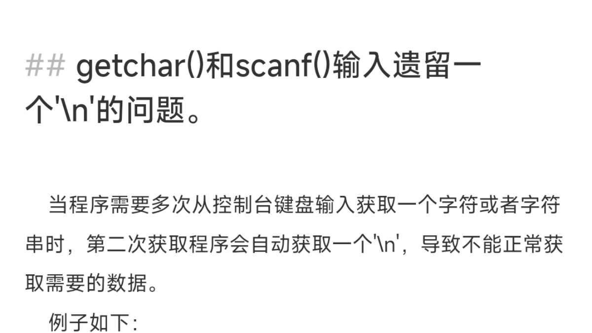getchar()和scanf()输入遗留一个换行符的问题。 getchar()和scanf()输入遗留一个’’的问题。当程序需要多次从控制台键盘输入获取一个字符或者字符串时,第二次获取程序会自动获取一个'',导致不能正常获取需要的数据。例子如下:#include<stdio.h>int main(void){ char ch1,ch2; printf("input the first code: "); scanf("%c",&ch1); printf("input the second code: "); scan