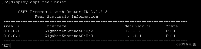 配置完成后,等待一段时间,查看R2上的简要OSPF邻居信息。