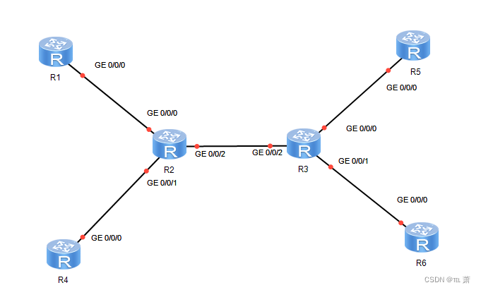 本实验模拟企业网络环境,R3,R5,R6属于公司总部骨干区域路由器,R2为ABR。公司分部路由器R1和R4都属于区域1,但分属不通部门,R1作为市场部门网关,R4作为财务部门网关。网络管理员在区域0和区域1上配置OSPF区域认证。其中区域0开启密文认证,区域1开启明文认证。为进一步提高该OSPF网络安全性,R2和R4上单独设置密钥,配置OSPF链路认证。