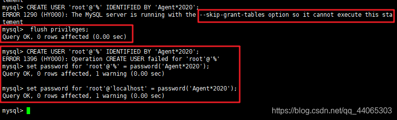 如果执行以上的设置密码命令出现错误ERROR 1290 (HY000): The MySQL server is running with the --skip-grant-tables option so it cannot execute this statement