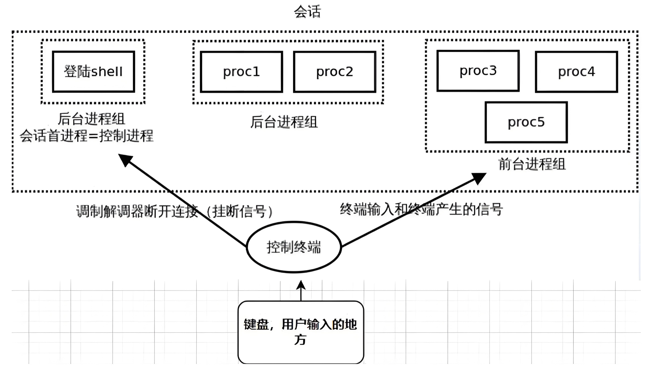 在 UNIX 系统中,用户通过终端登录系统后得到一个 Shell 进程,这个终端成为 Shell进程的控制终端。控制终端是保存在 PCB 中的信息,我们知道 fork 进程会复制 PCB中的信息,因此由Shell 进程启动的其它进程的控制终端也是这个终端。默认情况下没有重定向,每个进程的标准输入、标准输出和标准错误都指向控制终端,进程从标准输入读也就是读用户的键盘输入,进程往标准输出或标准错误输出写也就是输出到显示器上。另外会话、进程组以及控制终端还有一些其他的关系,我们在下边详细介绍一下: