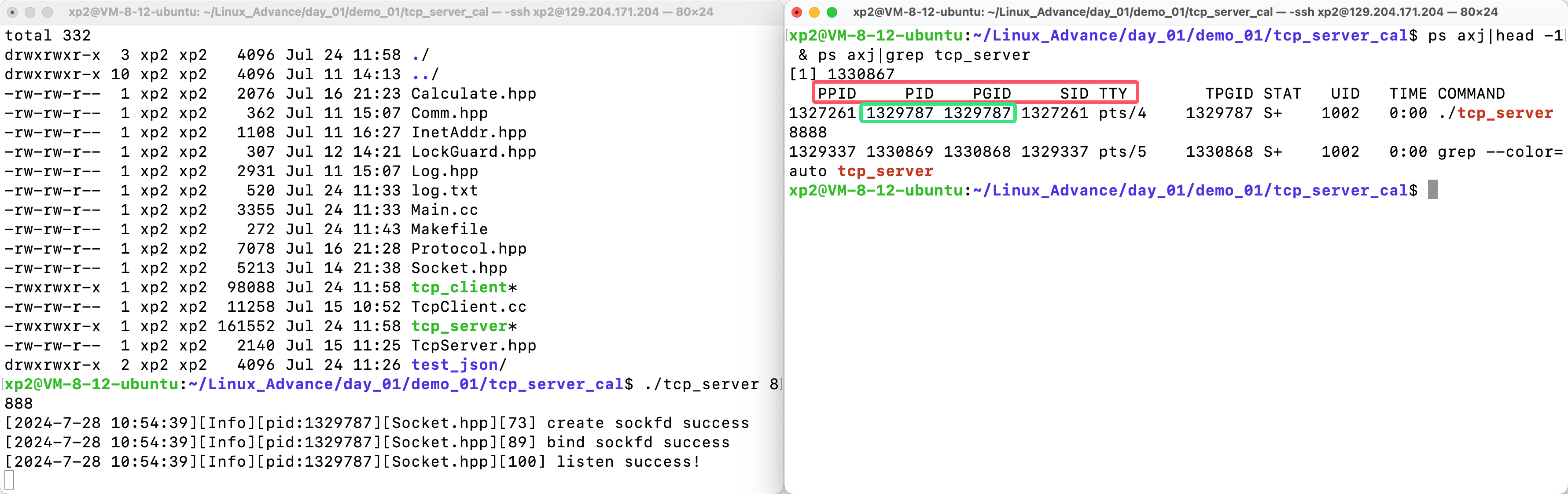 ps axj|head -1 & ps axj|grep tcp_server