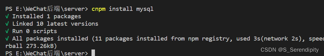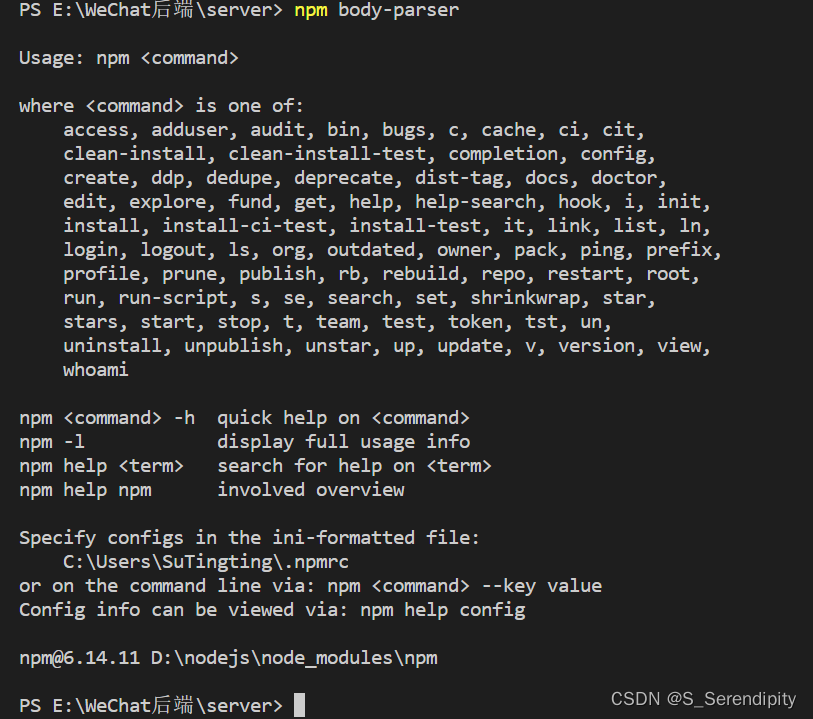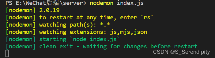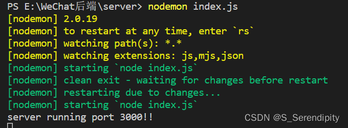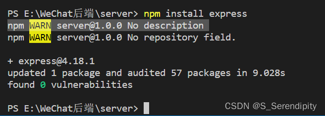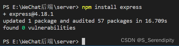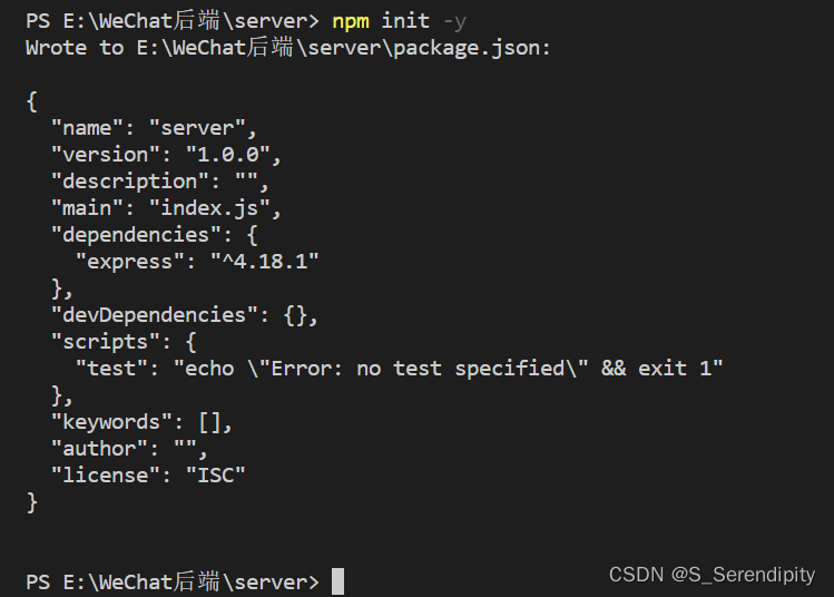 1.nodejs下载并安装,使用VS code编辑器,首先创建空目录server,终端中进入server目录下,初始化项目,自动创建package.json配置文件:npm init -y