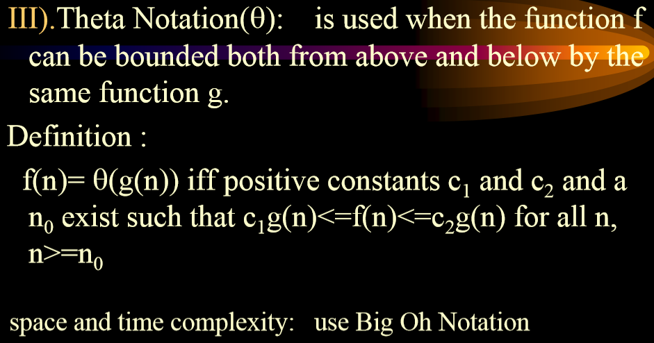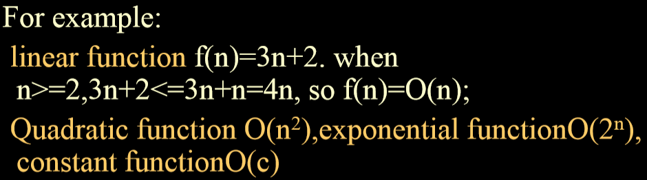 - 定义:f(n)=O(g(n)) iff positive constant c and n0 exist such that f(n) <=c * g(n) for all n, n>=n0