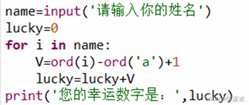 2、数字命理学家”认为能够基于名字的“数值”来找到一个人的幸运数字。幸运数字等于名字中各字母值之和。其中a的值为1,b的值为2,c的值为3,。。,z的值为26。写程序,求出你的幸运数字。