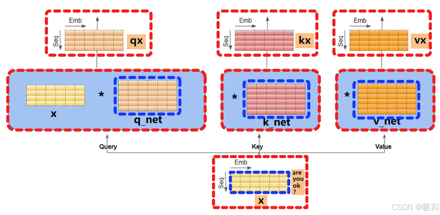 以编码器中的“自注意力机制层”说明自注意力机制的计算过程,首先输入的数据是经过位置编码后,Are you ok?用黄色的词向量矩阵XX会分别和三个线性层,q k 和v 做线性变换,得到三组结果。这个过程实际上并没有什么特别的,就是最基础的线性层计算。