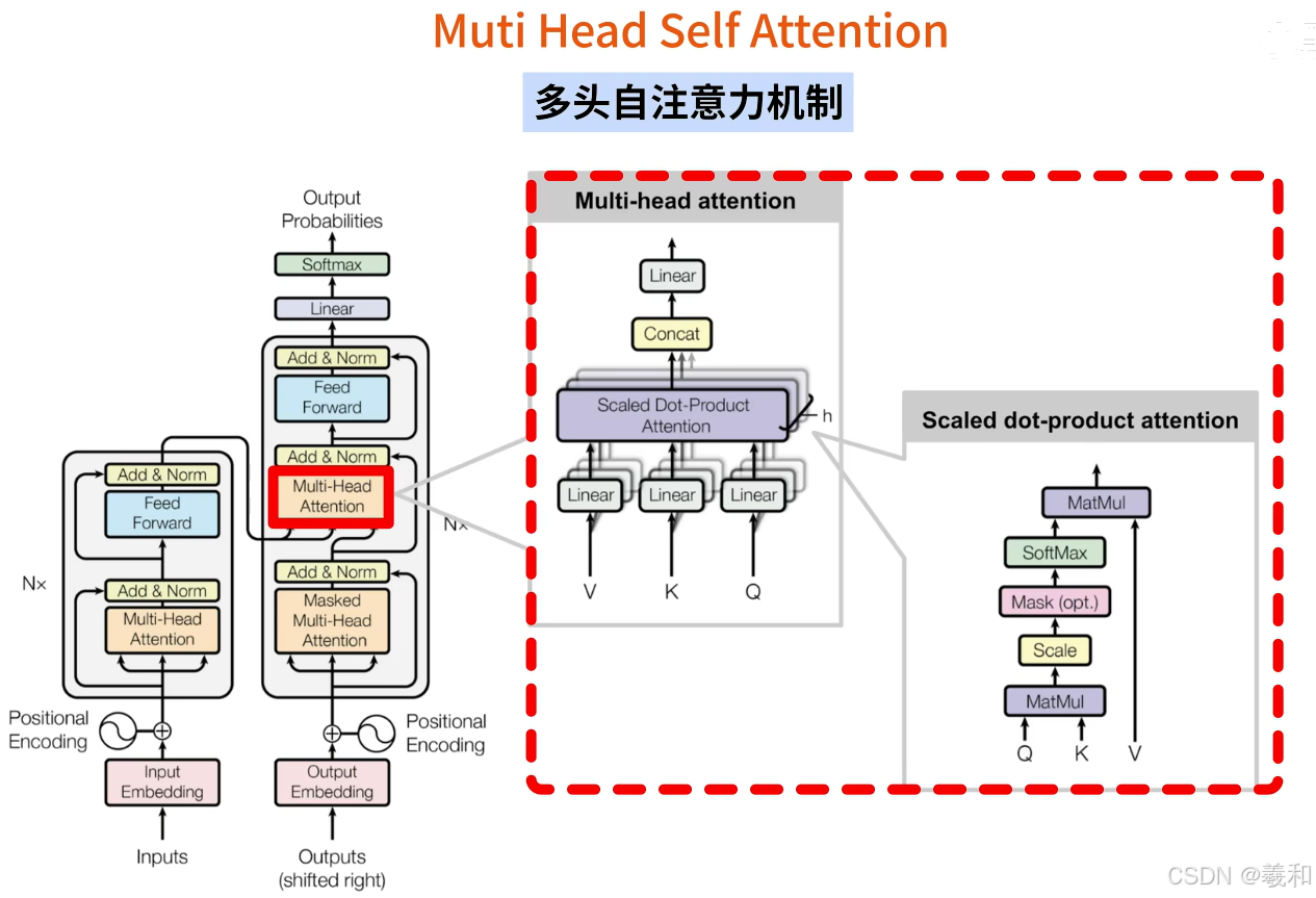 多头自注意力机制,是transformer最核心的部分。整体架构如下: