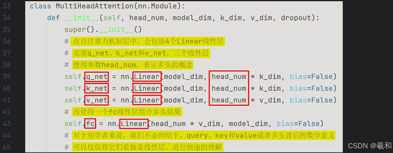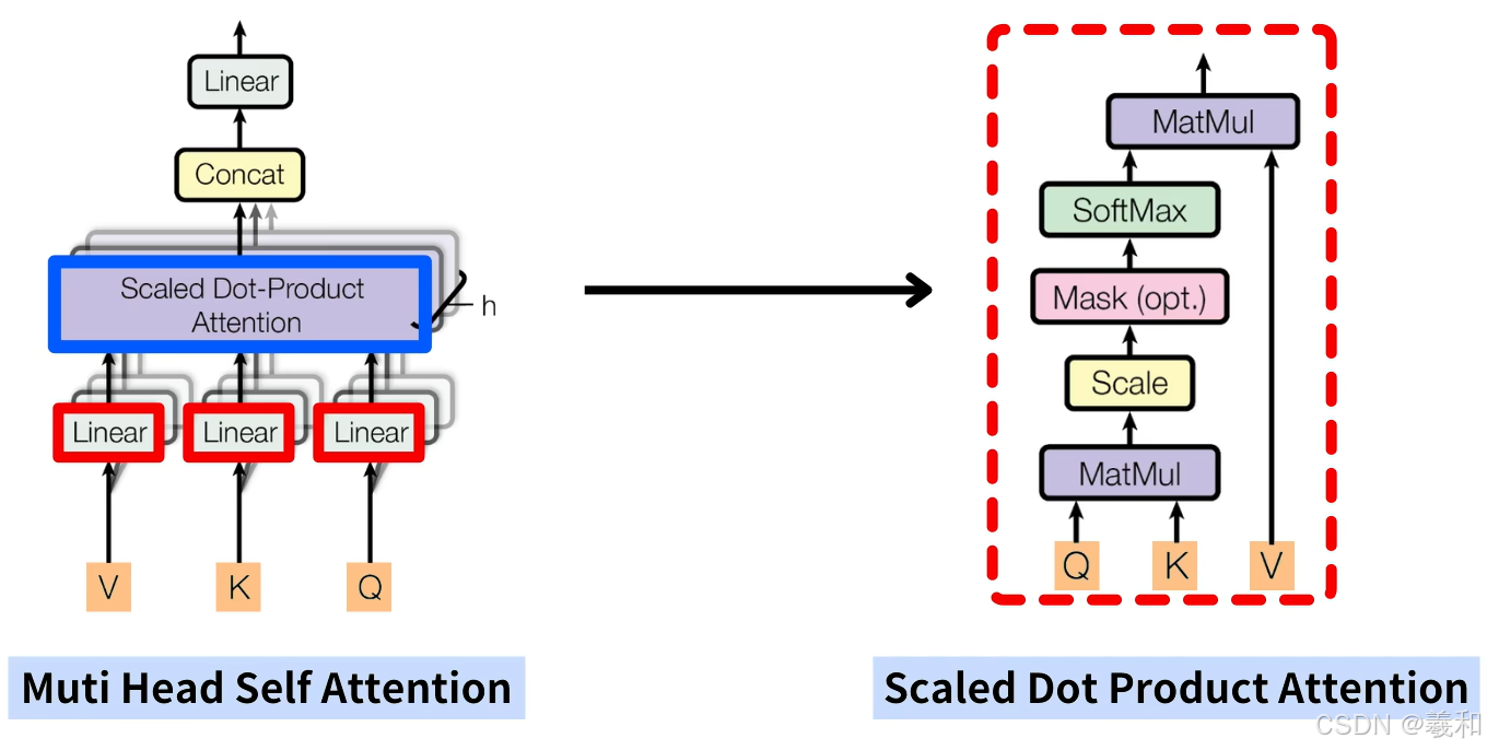多头顾名思义就是同时通过多个自注意力机制进行特征提取,图不同深度的颜色就代表了多头,h表示了多头的数量,完成多头的计算后,再使用一个线性层,将多组自注意力机制的计算结果进行结合再输出。共包含四个线性层。