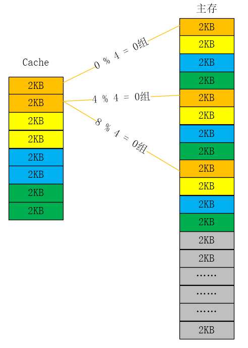 如下图,在主存中,橙色块 = 【主存块号】%【Cache分组数(4)】 = 0( 属于Cache的第0组)