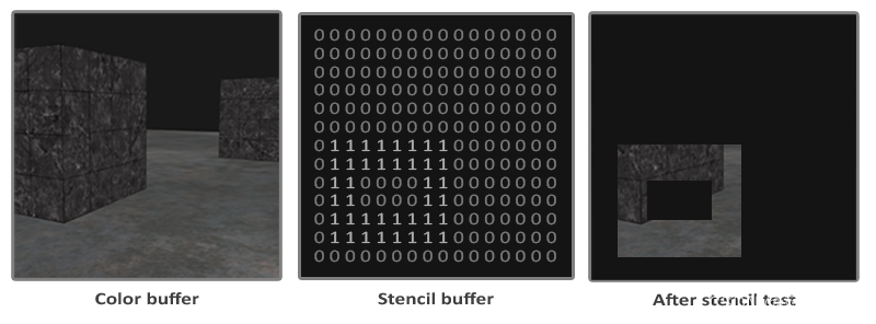 一个模板缓冲中,(通常)每个模板值(Stencil Value)是8位的。所以每个像素/片段一共能有256种不同的模板值。我们可以将这些模板值设置为我们想要的值,然后当某一个片段有某一个模板值的时候,我们就可以选择丢弃或是保留这个片段了。