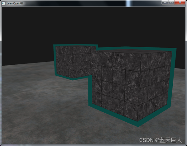 我们将模板函数设置为GL_NOTEQUAL,它会保证我们只绘制箱子上模板值不为1的部分,即只绘制箱子在之前绘制的箱子之外的部分。注意我们也禁用了深度测试,让放大的箱子,即边框,不会被地板所覆盖。