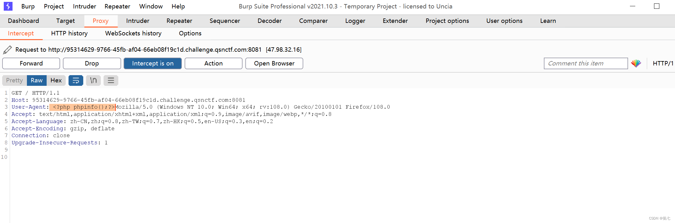 这里就要用到burpsuite来拦截请求包,修改里面的User-Agent字段: