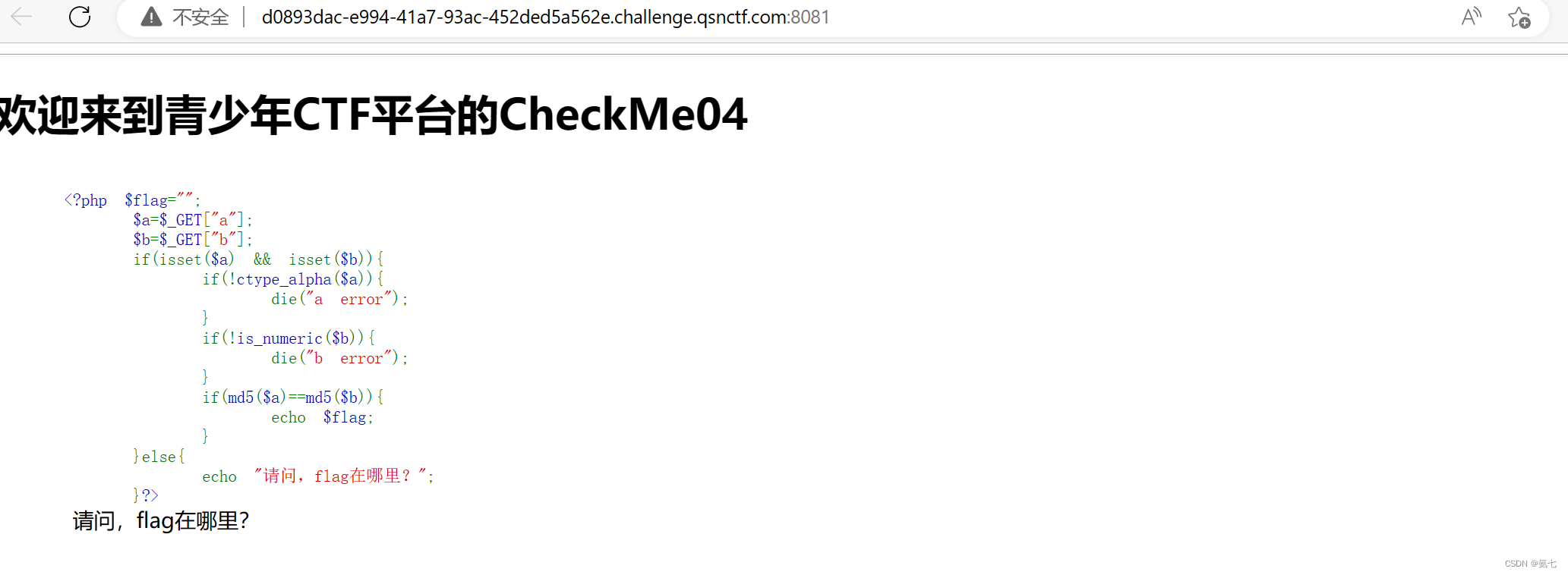 分析一下这段代码,变量a只能为字母,b只能为数字,然后他们各自的MD5值如果想等就输出flag。