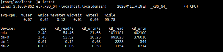Linux 3.10.0-862.el7.x86_64 (localhost.localdomain) 2020年11月19日 _x86_64_ (4 CPU) 从左往右 内核版本 日期 框架 CPU个数