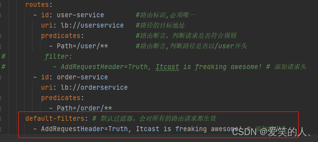 如果要对所有的路由都生效,则可以将过滤器工厂写到default下。格式如下: