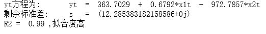 equation_yt = 'yt方程为:' + '\tyt' + ' = ' + '363.7029' + ' + ' + '0.6792' + '*x1t ' + '- ' + '972.7857' + '*x2t'