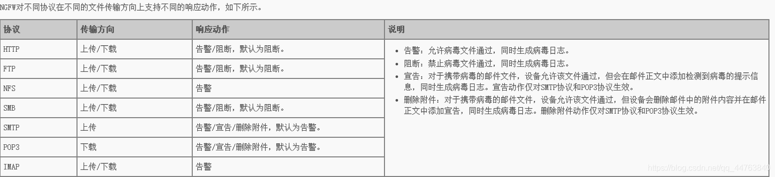 NGFW支持对使用以下协议传输的文件进行病毒检测: