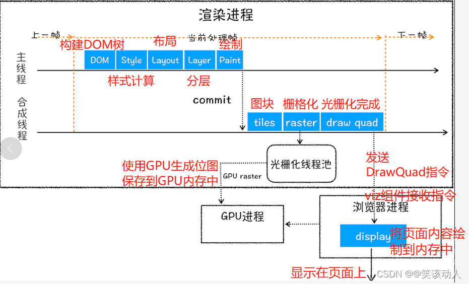 当所有都被光栅化,渲染进程的合成线程会生成一个绘制图块的命令'DrawQuad',然后将该命令提交给 浏览器主进程