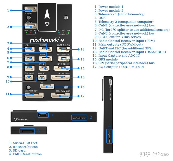 此处以常用的Pixhawk4为例,简单介绍各个端口的用处。PX4飞控常搭载的模块包括:GPS(或RTK)、定高雷达、数传、机载电脑、遥控器接收机等,不同模块接入的端口也都相对固定。这里特别针对串口提一嘴:目前市面上的飞控一般都有3个硬件串口接口,前两个硬件串口名称都是统一命名为TELEM1和TELEM2,后面一个硬件串口名称则可能为UART或TELEM4。Pixhawk4中叫【UART&I2C】端口,在雷迅飞控中则命名为【UART4】。
