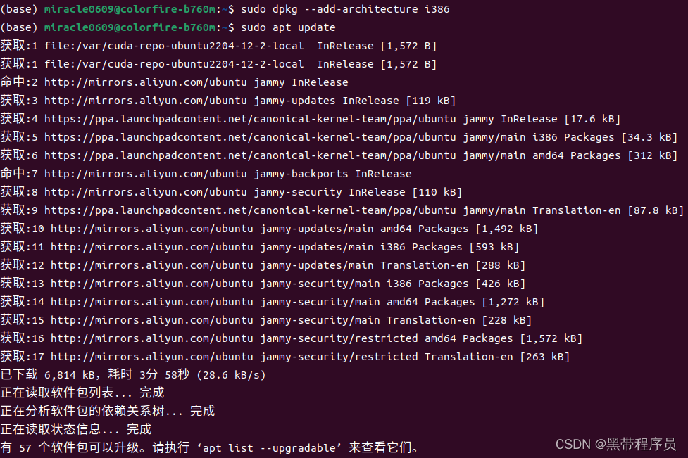 某些应用程序只能在Windows和MacOS系统中安装使用,如果需要在Ubuntu下使用windows平台的应用程序,需要用Wine程序,Wine是一个开源兼容层,支持在诸如Linux,FreeBSD和MacOS等UNIX的操作系统上运行Windows应用程序。最后运行下列命令安装wine最新稳定版本,虽然带宽足够,但是下载速度很慢,只有20+kb/s, 需要等待很长时间(下了很久才下完)。安装完成后,调用wine --version查看版本,目前最新稳定版本为9.0。至此,Wine安装完毕。