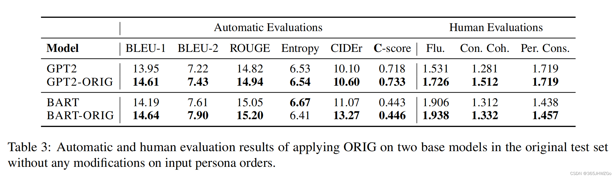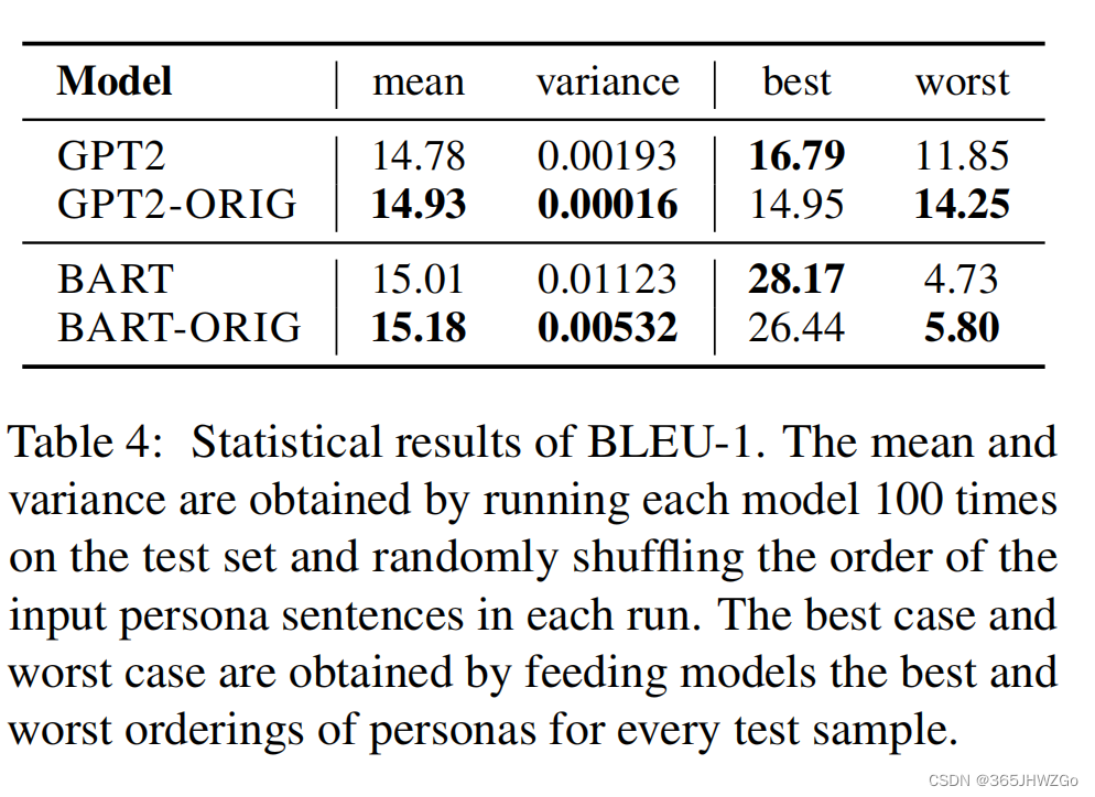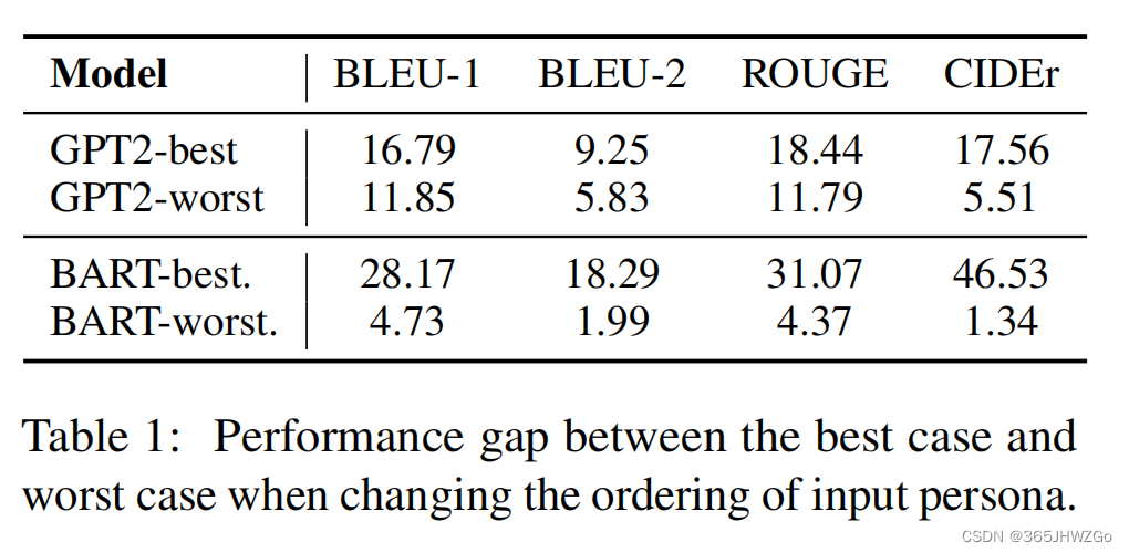 更具体的实验数据可以从上表中看出,作者将个性化信息所有可能的结果拼接上上下文依次输入到模型中,将最好的结果和最差的结果分别记录下来,由此得知,the ordering of persona in the input leads to different representations of context and response