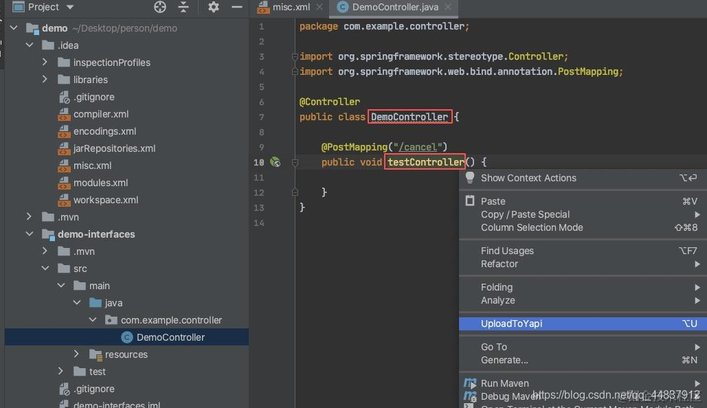 选中所要上传的方法名或类名(上传的是该类下的所有接口)右击,再UploadToYapi