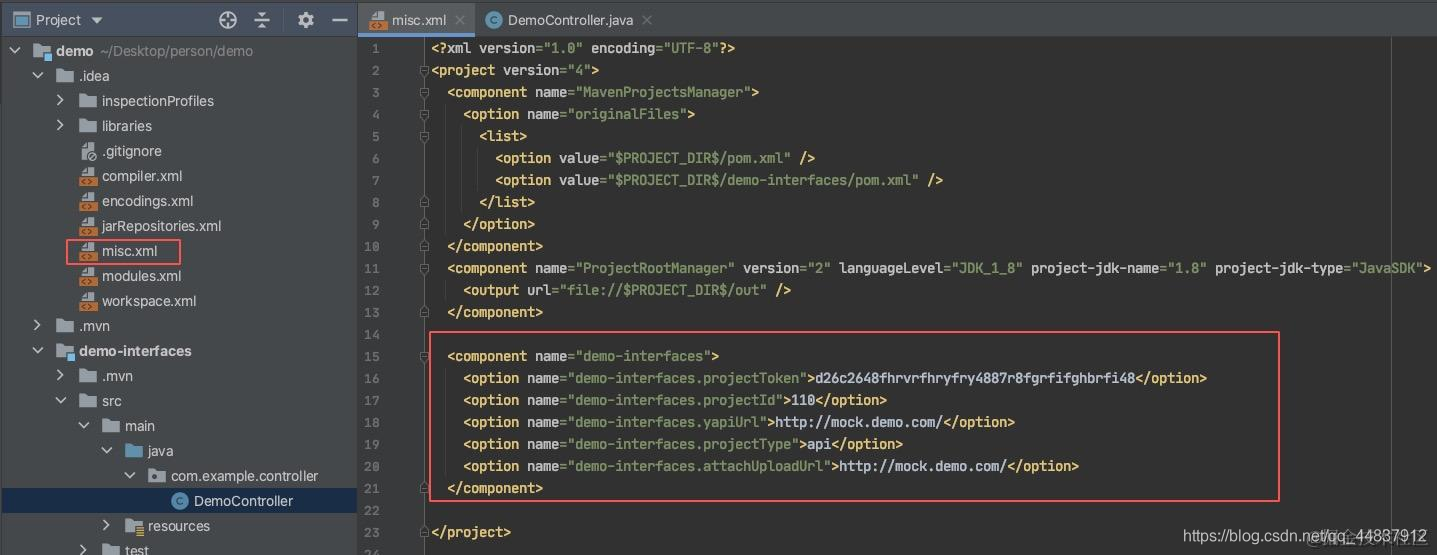 <component name="项目名"> <option name="projectToken">YApi中项目的token</option> <option name="projectId">YApi中项目的id</option> <option name="yapiUrl">部署的YApi地址</option> <option name="projectType">api</option> <option name="attachUploadUrl">上传java类zip的url</option> </component> -