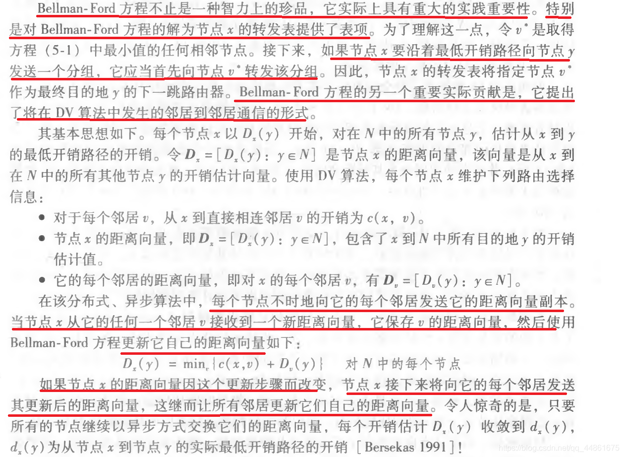 距离向量算法是一种迭代的、异步的和分布式算法,而LS算法是一种使用全局信息的算法。为什么是分布式的呢,因为每个节点都要从一个或者多个直接相连邻居接受某些信息,执行计算,然后将其计算结果分发给邻居。说它是迭代的,是这个过程一直持续到邻居之间无更多信息交换为止。说它是异步的,因为它不要求所欲的节点相互之间步伐一致地操作。该算法是自我终止,即没有计算应该停止的信号,它就停止了。