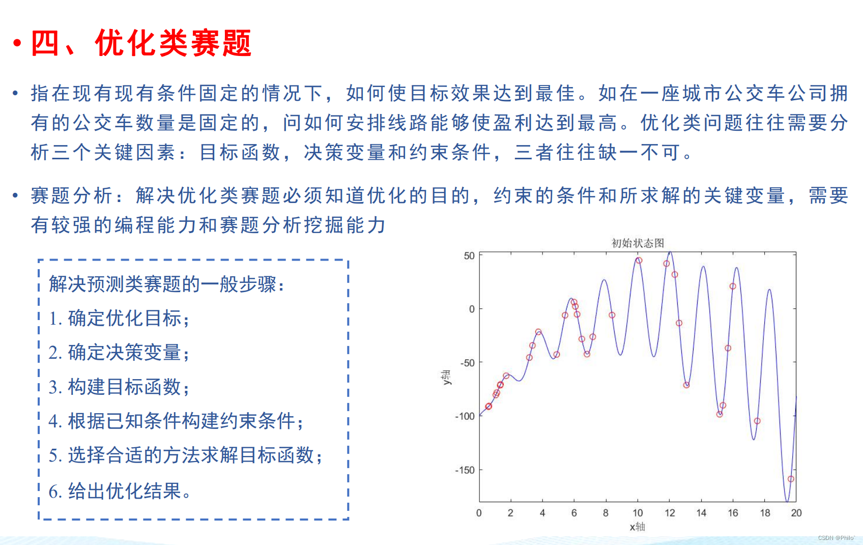 指在现有现有条件固定的情况下,如何使目标效果达到最佳。如在一座城市公交车公司拥有的公交车数量是固定的,问如何安排线路能够使盈利达到最高。优化类问题往往需要分析三个关键因素:目标函数,决策变量和约束条件,三者往往缺一不可。