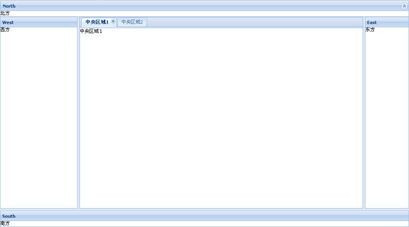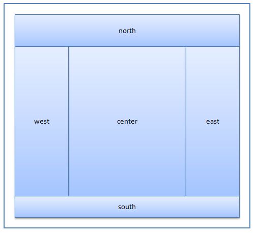 如下图所示,Ext的Layout可分解为东、西、南、北、中5个基本区域。