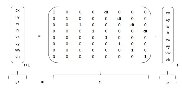 在公式1中,x为track在t-1时刻的均值,F称为状态转移矩阵,该公式预测t时刻的x’: