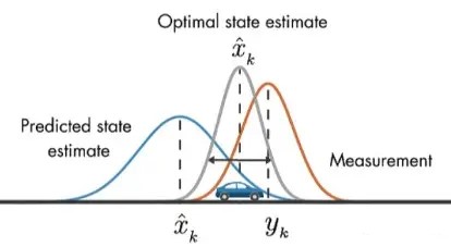 们要跟踪小车的位置变化,如下图所示,蓝色的分布是卡尔曼滤波预测值,棕色的分布是传感器的测量值,灰色的分布就是预测值基于测量值更新后的最优估计。