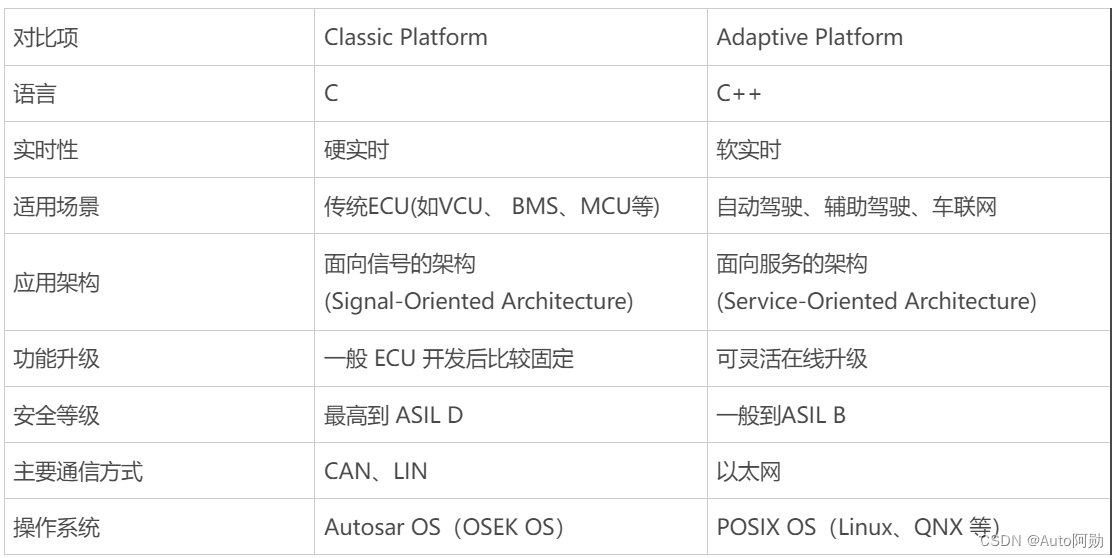 Adaptive AUTOSAR (AP)简介 AUTOSAR(AUTomotiveOpenSystemARchitecture)中文叫全球性的汽车开放式系统架构。她是由汽车主机厂、零部件供应商、半导体厂商、软件服务商、工具提供商以及其他相关的厂商于2003年联合成立的一个组织,致力于为汽车电子行业提供一个开放、标准化的汽车软件架构。AUTOSAR分两种:Classic Platform 经典平台AUTOSAR(简称CP) 和 Adaptive Platform 自适应平台AUTOSAR(简称AP)。