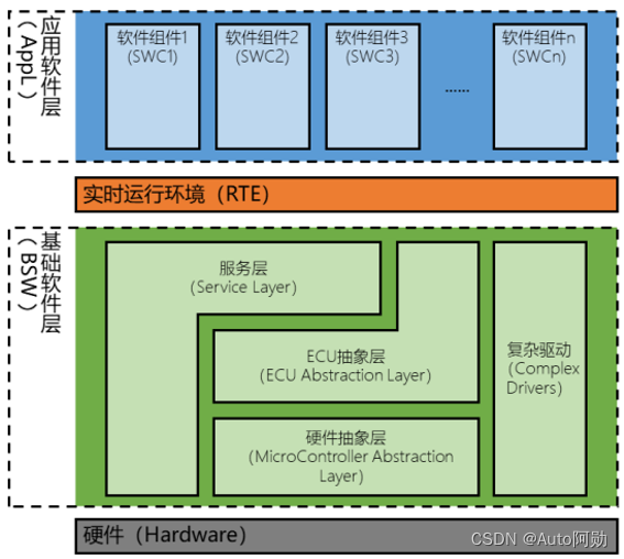 AutoSAR入门篇学习总结 从AUTOSAR架构来看,软件自上而下分别为应用软件层(Application Software Layer,ASW)、运行时环境(Runtime Environment,RTE)、基础软件层(Basic Software Layer,BSW)和微控制器(硬件)(Microcontroller/Hardware)。为保证上层与下层的无关性,在通常情况下,每一层只能使用下一层所提供的接口,并向上一层提供相应的接口。