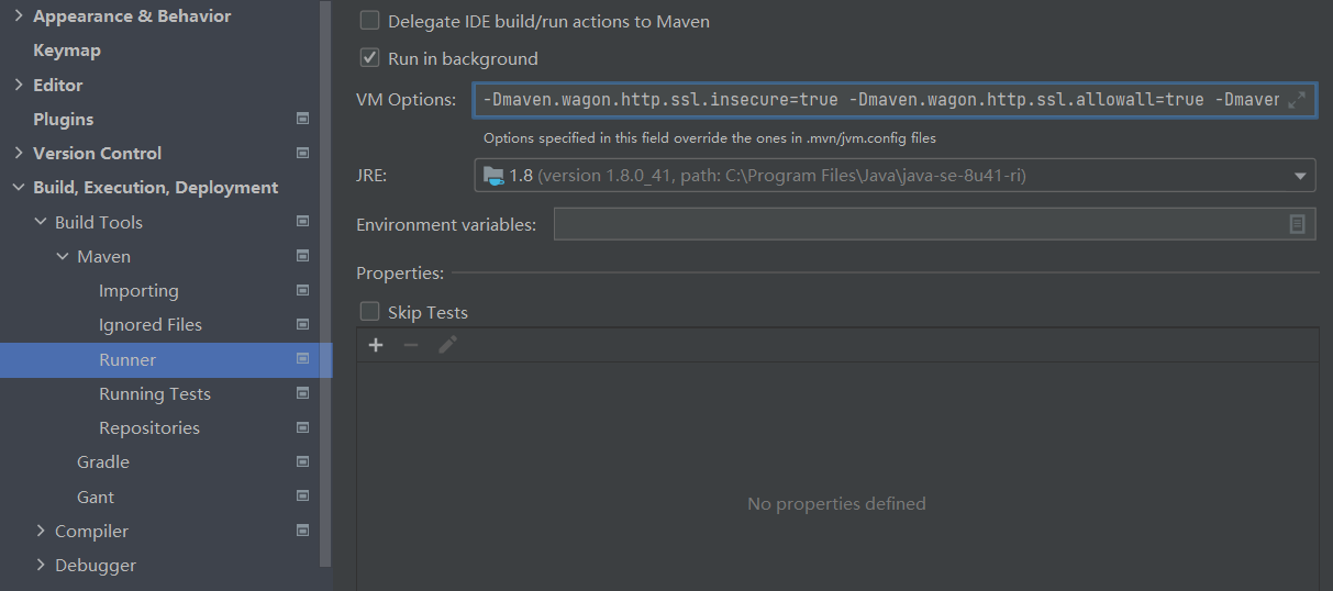 VM Options : -Dmaven.wagon.http.ssl.insecure=true -Dmaven.wagon.http.ssl.allowall=true -Dmaven.wagon.http.ssl.ignore.validity.dates=true