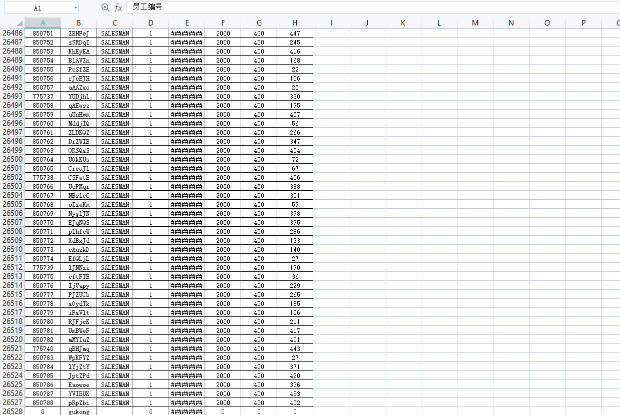 insert into emp values ((start+i) ,rand_string(6),'SALESMAN',0001,curdate(),2000,400,rand_num());