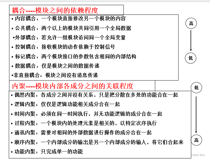 模块独立性取决于模块的内部和外部特征。一般用耦合和内聚两个定性的指标来度量。