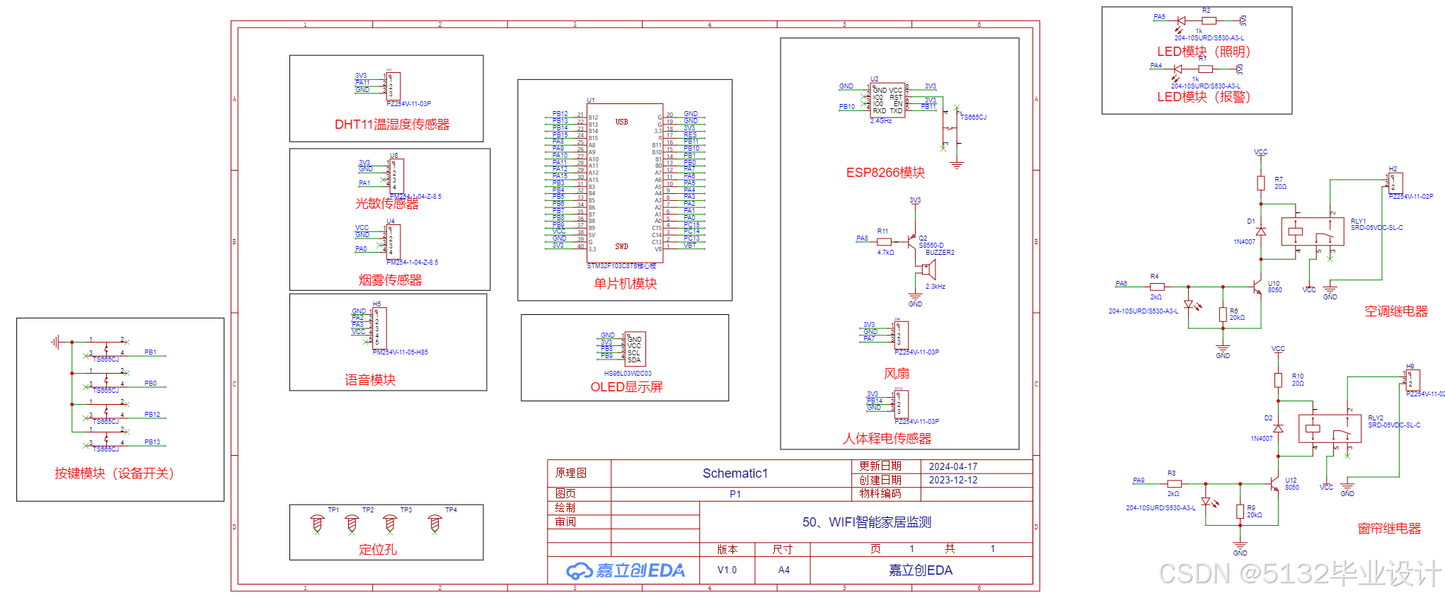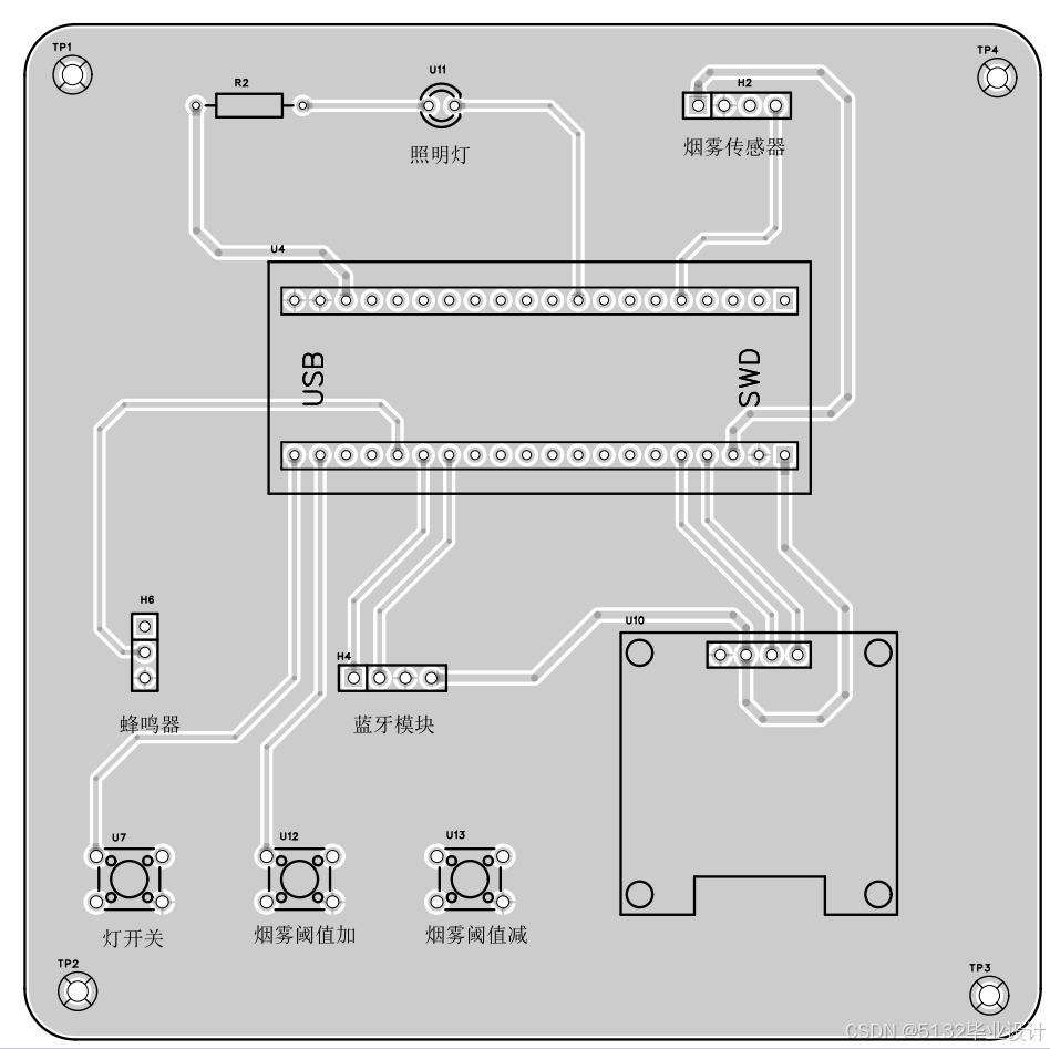 - LED灯和蜂鸣器组成了声光报警装置。
