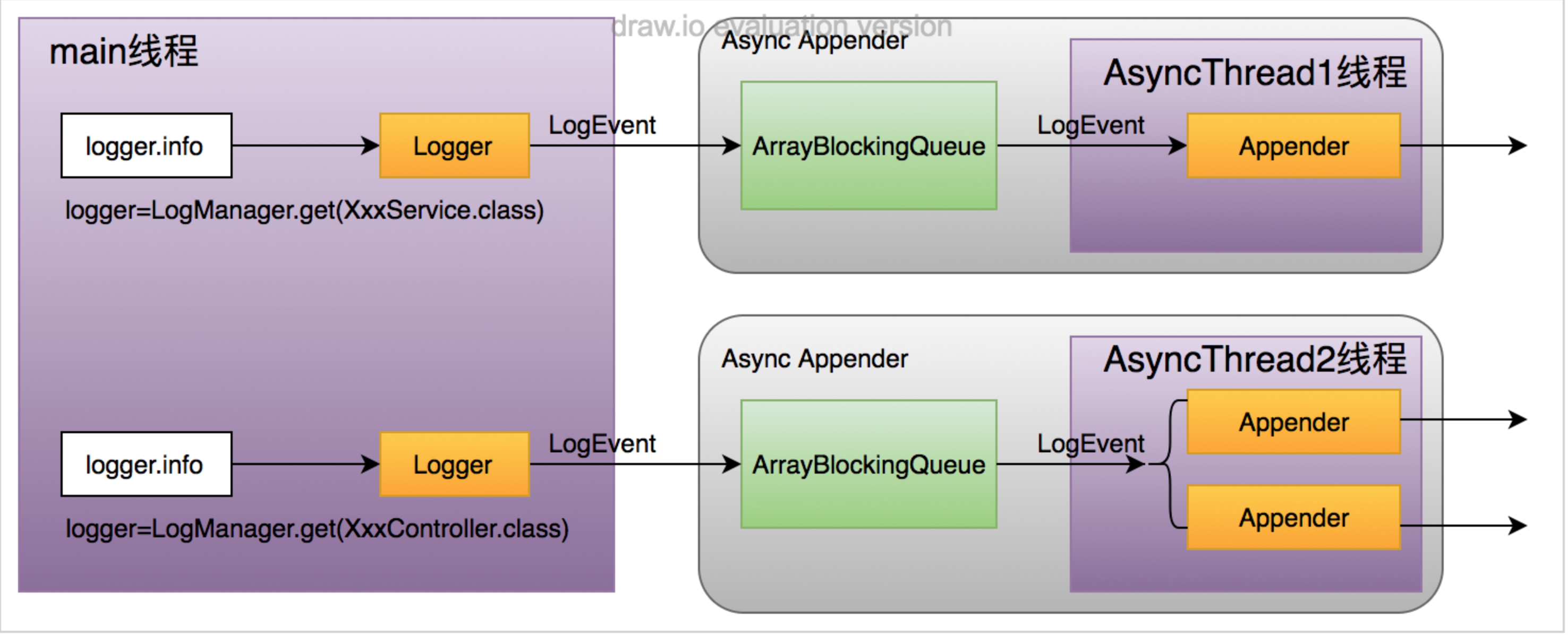 每个Async Appender,内部维护了一个ArrayBlockingQueue,并将创建一个线程用于输出日志事件,如果配置了多个AppenderRef,将分别使用对应的Appender进行日志输出。