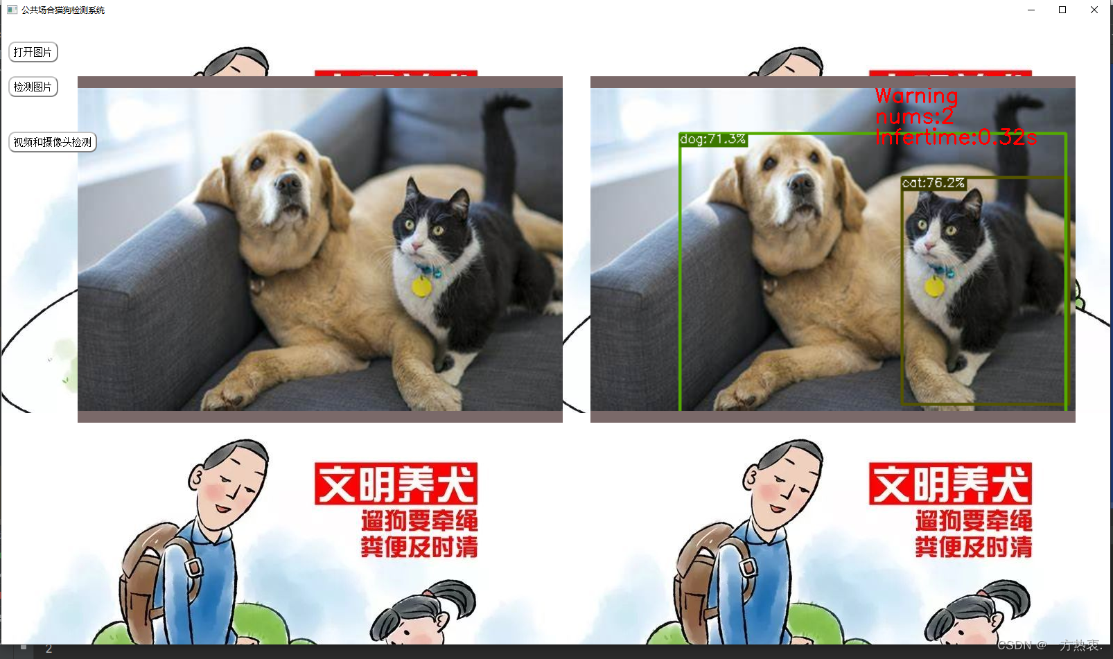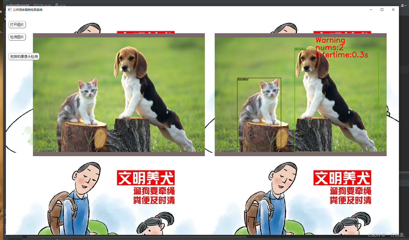文章展示了如何使用PyQt5构建一个用户界面,结合YOLOX对象检测算法,实现对公共场合中猫狗的实时检测。用户可以选择开启摄像头或上传视频进行检测,检测结果会在界面上即时显示。系统还提供了图片检测功能,可检测单张图片中的猫狗。