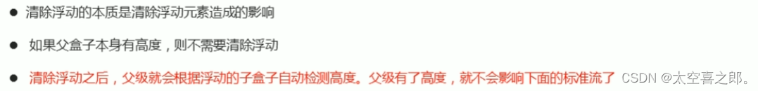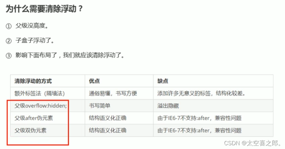 由于父级盒子很多情况下,不方便给高度,但是盒子浮动又不占有位置,最后父级盒子高度为0时,就会影响下面的标准流盒子。