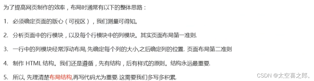 先用标准流的父级元素排列上下位置,之后内部子元素采取浮动排列左右位置。符合网页布局第一准则。