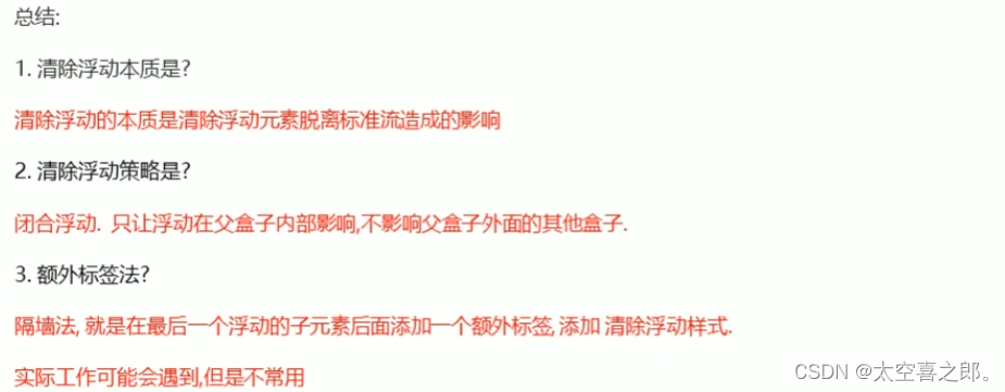 注意点:一个盒子里面有多个盒子,如果其中一个盒子浮动了,那么其他兄弟也应该浮动,以防止引起问题。