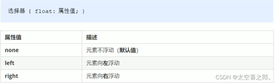 float属性用于创建浮动框,将其移动到一边,直到左边缘或右边缘触及包含块或另一个浮动框的边缘。